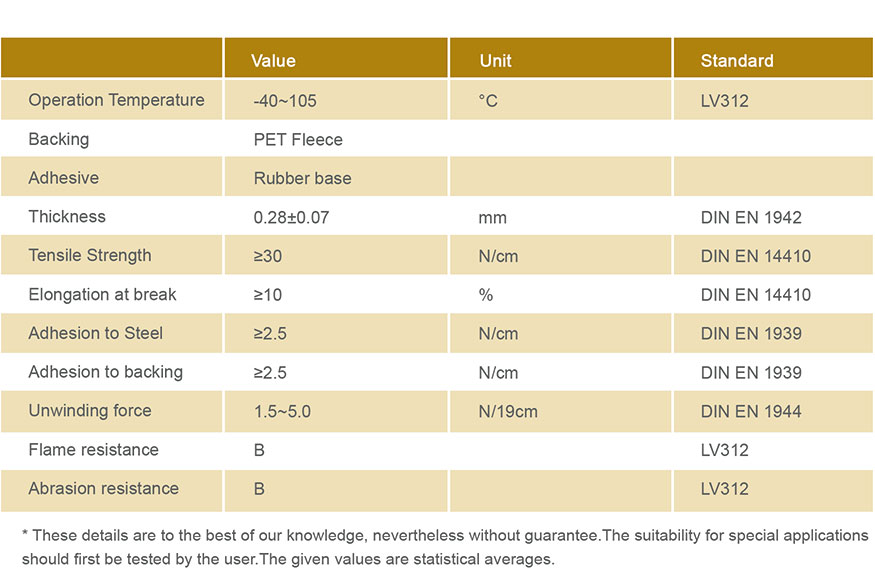 | The tape with high quality PET fleece as the base material.Coated with high performance rubber series hot melt adhesive, and with softness, good clothing, hand tear and other characteristics.To meet the requirements of low VOC, low odor. It suitable for instrument line, door line, mainly wiring harness and other noise reduction occasions. |